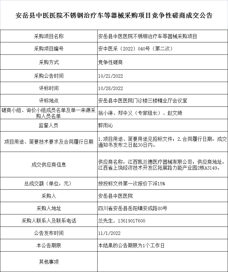 安岳县中医医院不锈钢治疗车等器械采购项目竞争性磋商成交公告