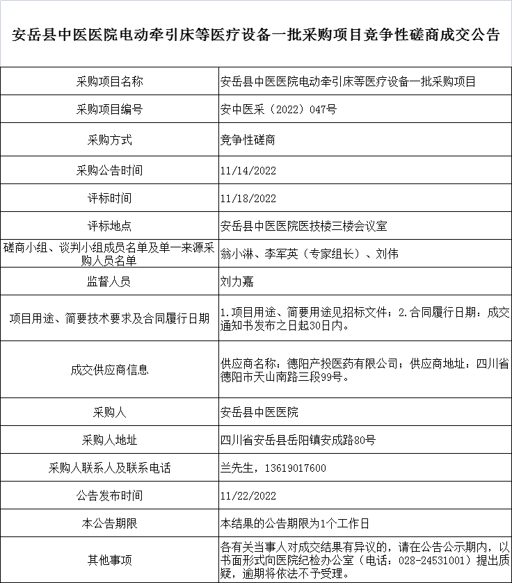 安岳县中医医院电动牵引床等医疗设备一批采购项目竞争性磋商成交公告