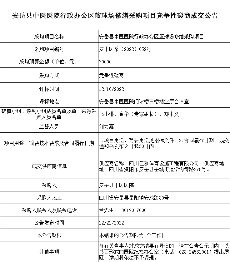安岳县中医医院行政办公区篮球场修缮采购项目竞争性磋商成交公告