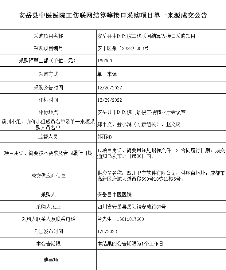 安岳县中医医院工伤联网结算等接口采购项目单一来源成交公告