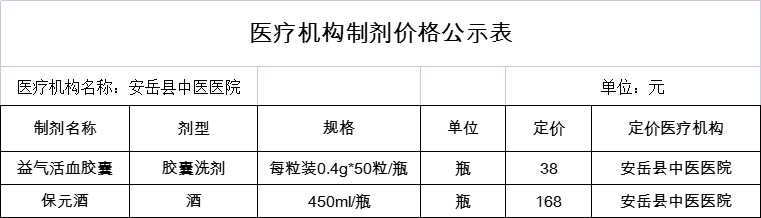 根据《关于印发推进医疗服务价格改革意见的通知》(发改价格〔2016〕1431号)、《关于印发四川省推进医疗服务价格改革实施方案的通知》(川发改价格〔2016〕580号)、《关于转发国家发改委等七部委“关于印发推进药品价格改革意见”的通知》(川发改价格〔2015〕660号),现将我院实行市场调节价的“保元酒”和“益气活血胶囊”2个院内制剂价格进行公示。公示期:2023年3月16日-2023年3月22日。