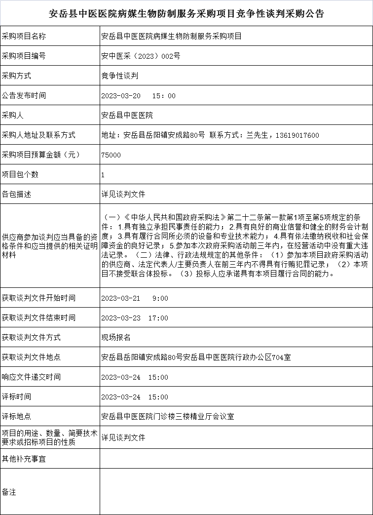 安岳县中医医院病媒生物防制服务采购项目竞争性谈判采购公告