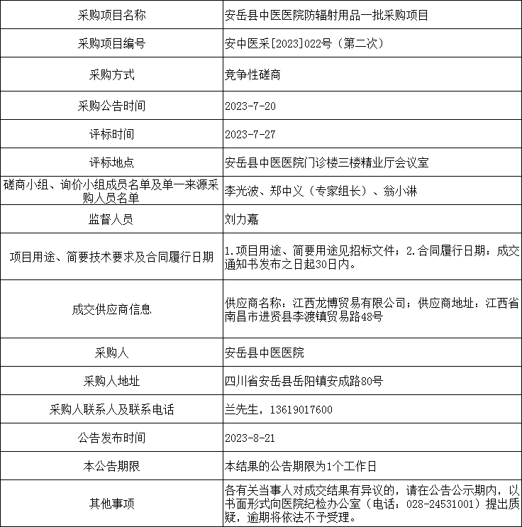 安岳县中医医院防辐射用品一批采购项目竞争性磋商成交公告