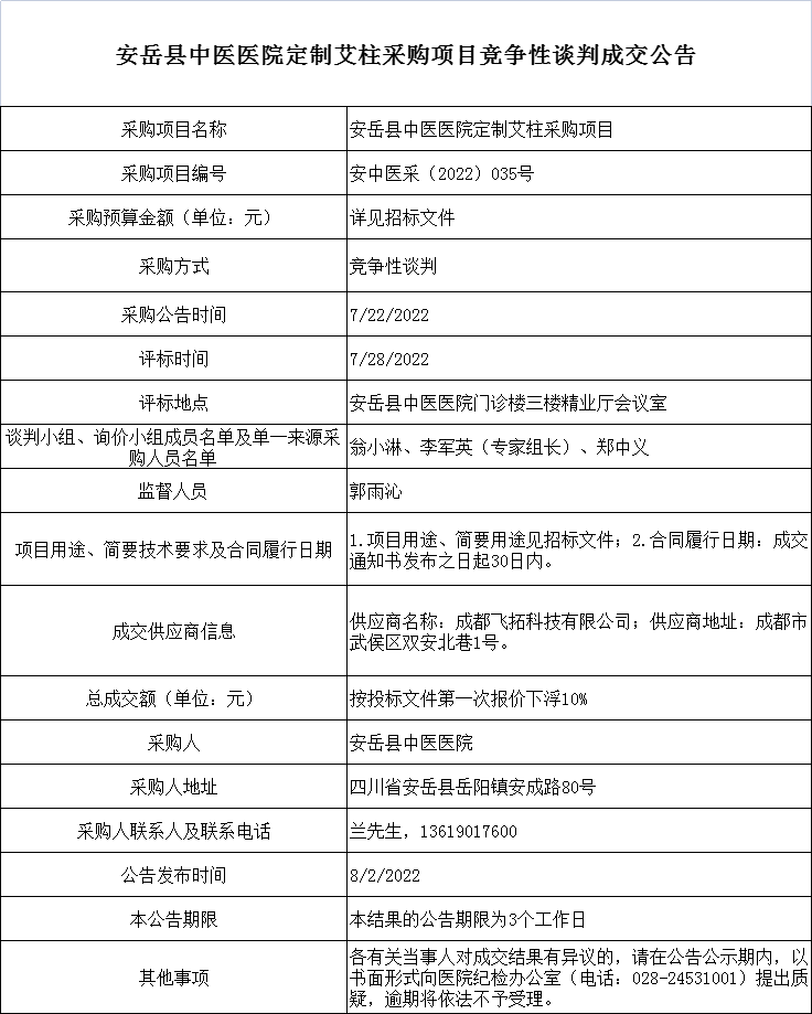 安岳县中医医院定制艾柱采购项目竞争性谈判成交公告