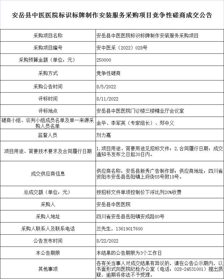 安岳县中医医院标识标牌制作安装服务采购项目竞争性磋商成交公告