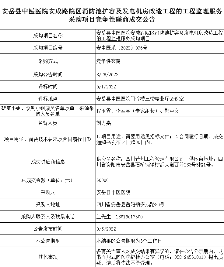 安岳县中医医院安成路院区消防池扩容及发电机房改造工程的工程监理服务采购项目竞争性磋商成交公告