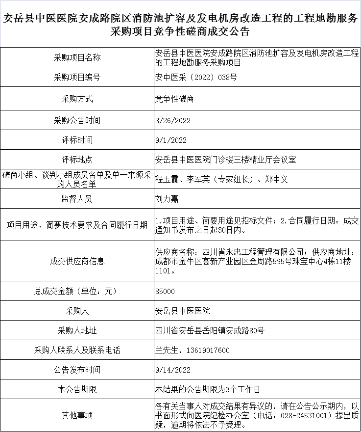 安岳县中医医院安成路院区消防池扩容及发电机房改造工程的工程地勘服务采购项目竞争性磋商成交公告