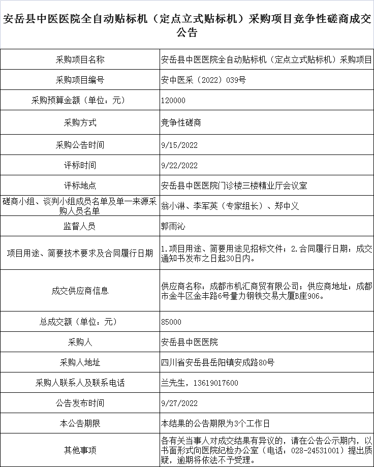 安岳县中医医院全自动贴标机(定点立式贴标机)采购项目竞争性磋商成交公告