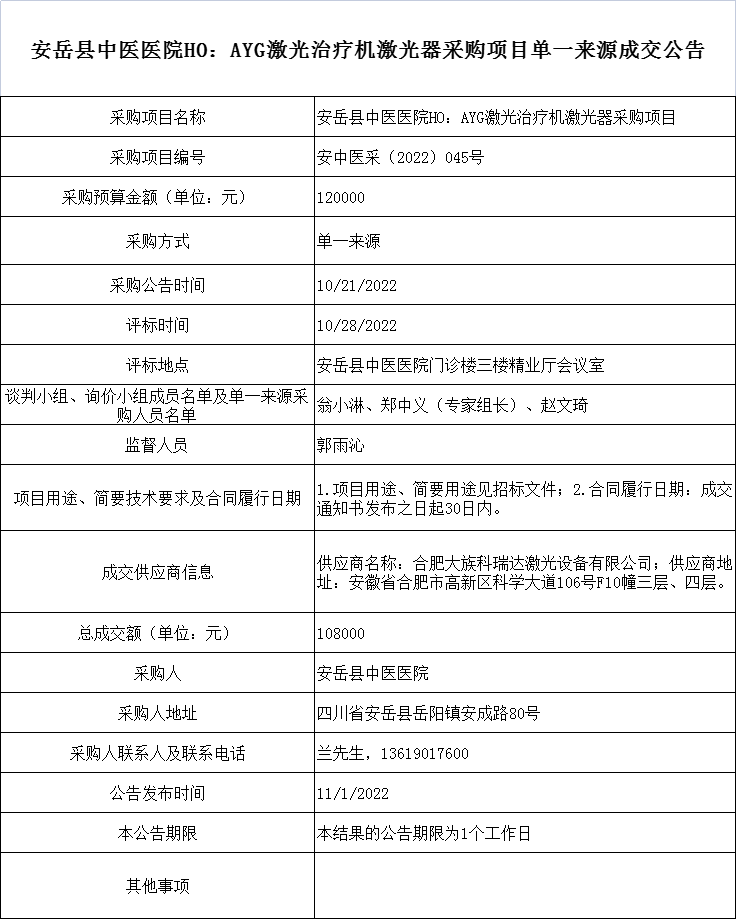 安岳县中医医院HO:AYG激光治疗机激光器采购项目单一来源成交公告