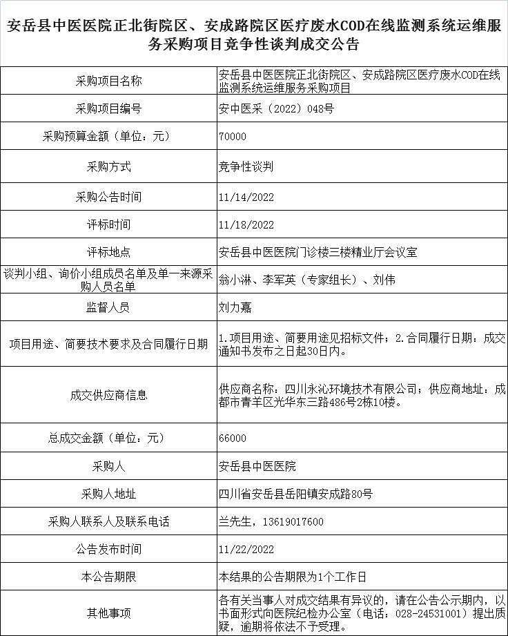 安岳县中医医院正北街院区、安成路院区医疗废水COD在线监测系统运维服务采购项目048号成交公告