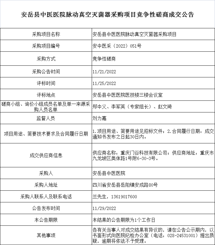 安岳县中医医院脉动真空灭菌器采购项目竞争性磋商成交公告
