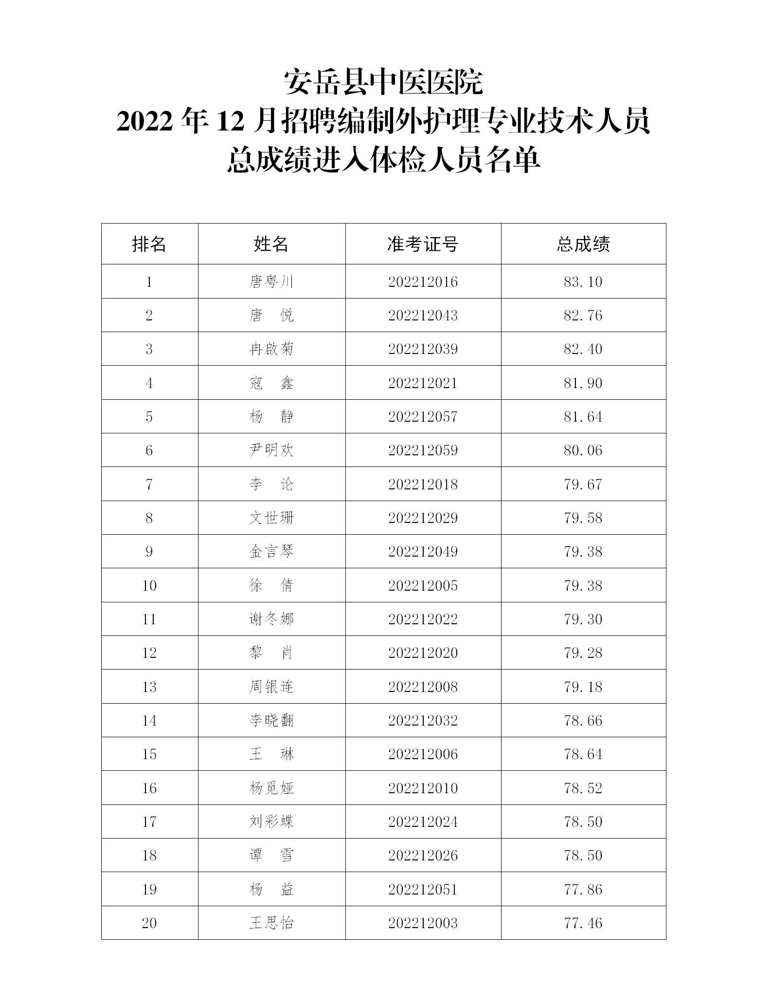 安岳县中医医院2022年12月招聘编制外护理专业技术人员总成绩进入体检人员名单