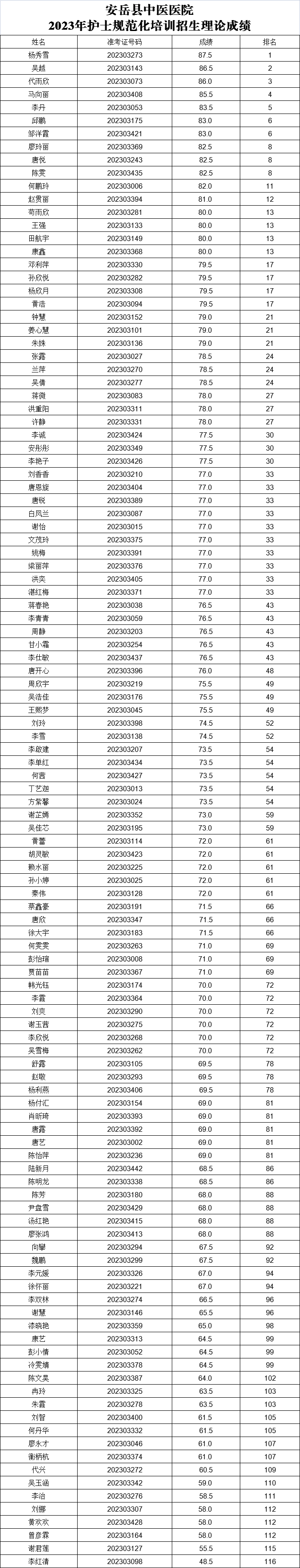 安岳县中医医院2023年护士规范化培训招生理论成绩