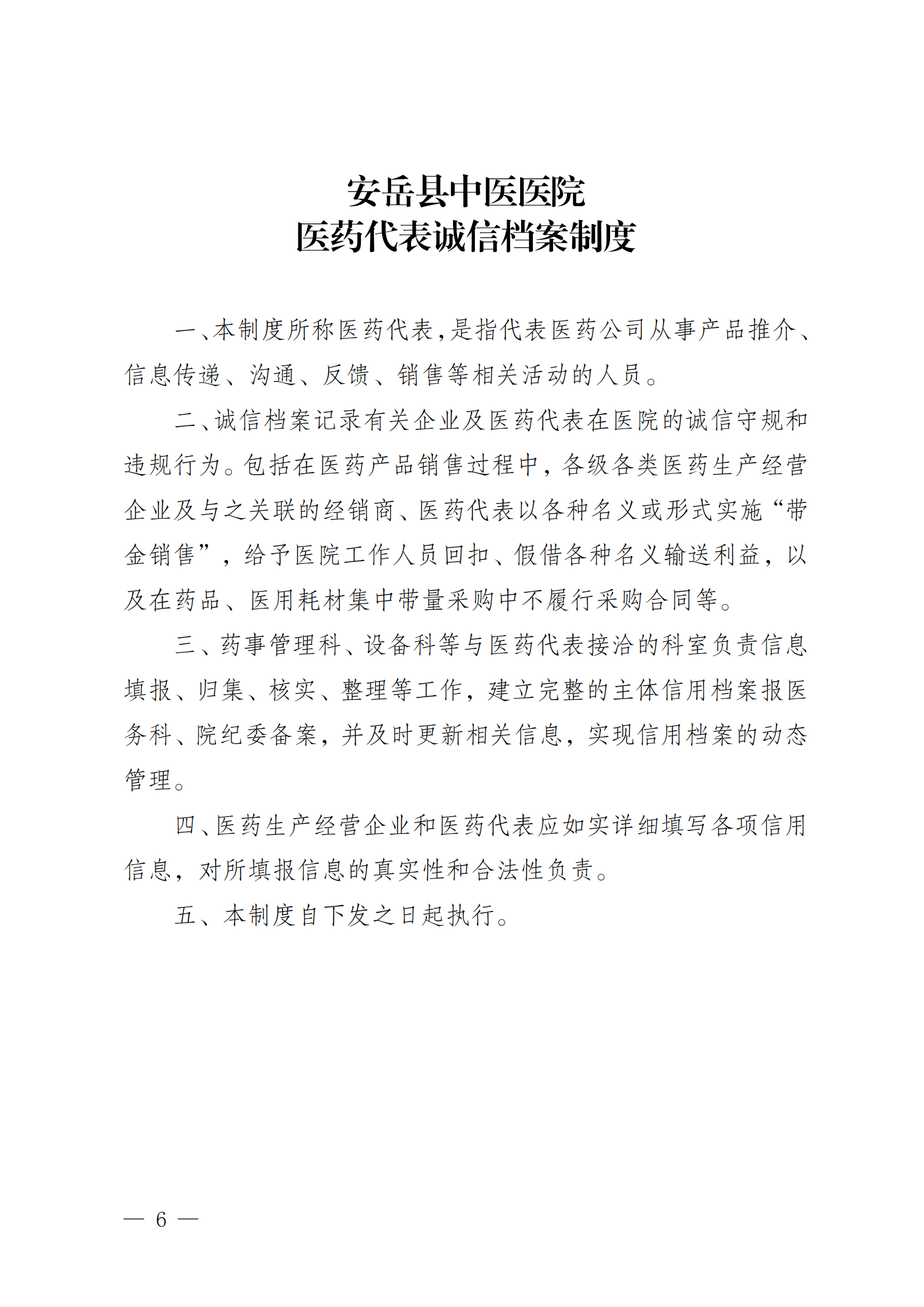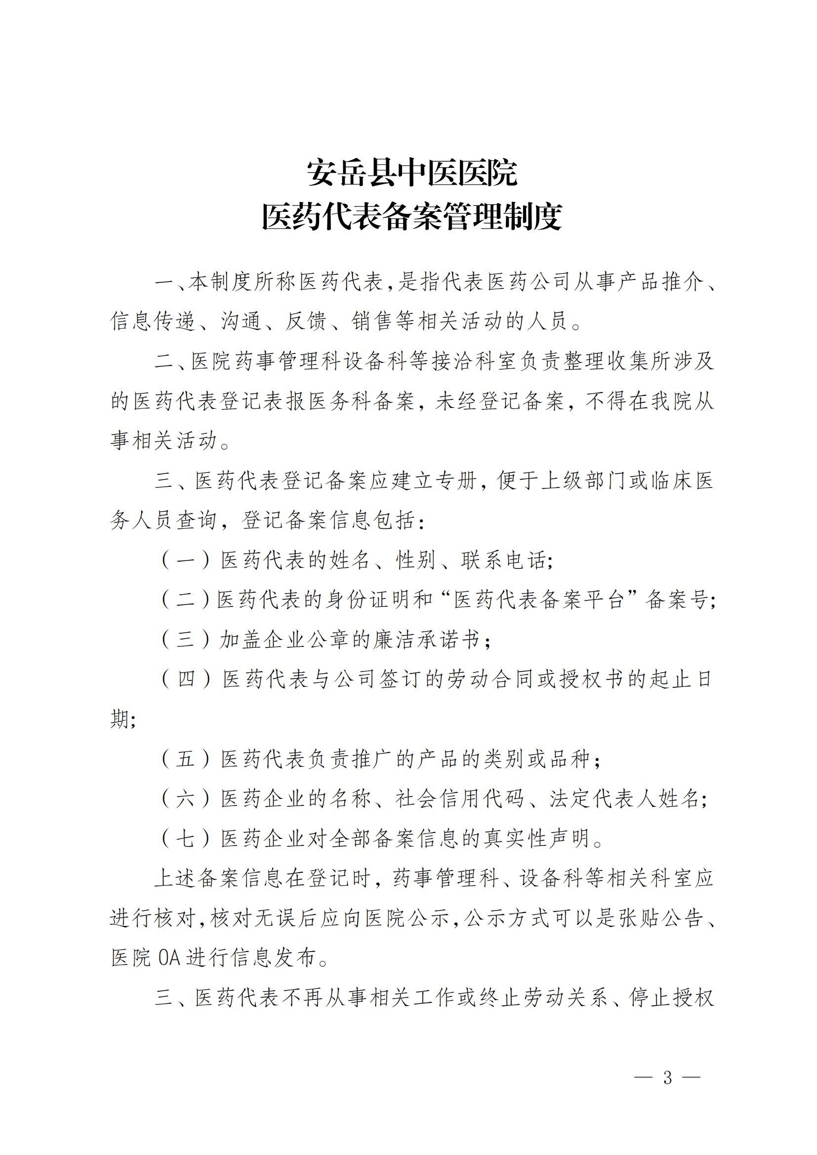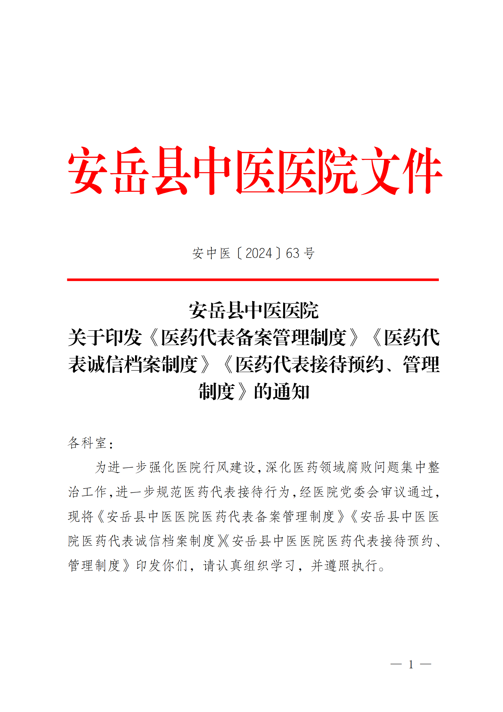 安中医〔2024〕63号 关于印发《医药代表备案管理制度》《医药代表诚信档案制度》《医药代表接待预约、管理制度》的通知